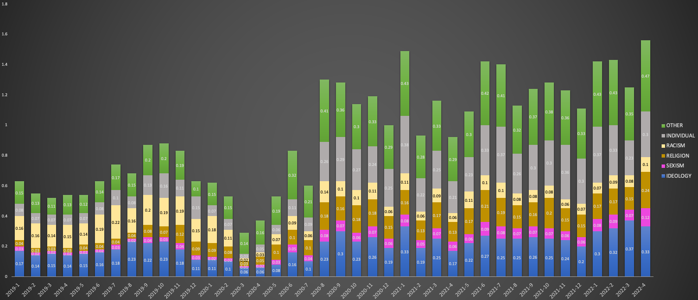 Chiffres : croissance du nombre de messages haineux en ligne - Source: Textgain