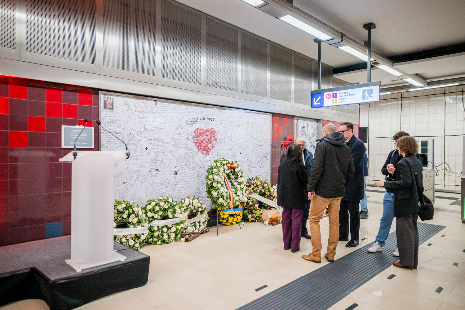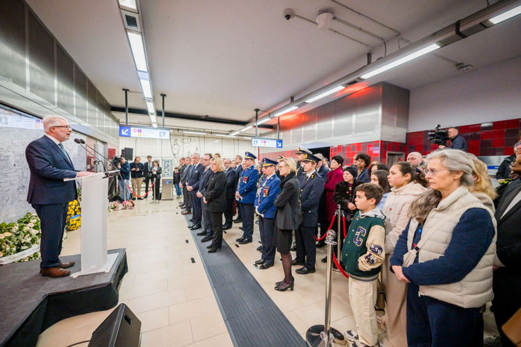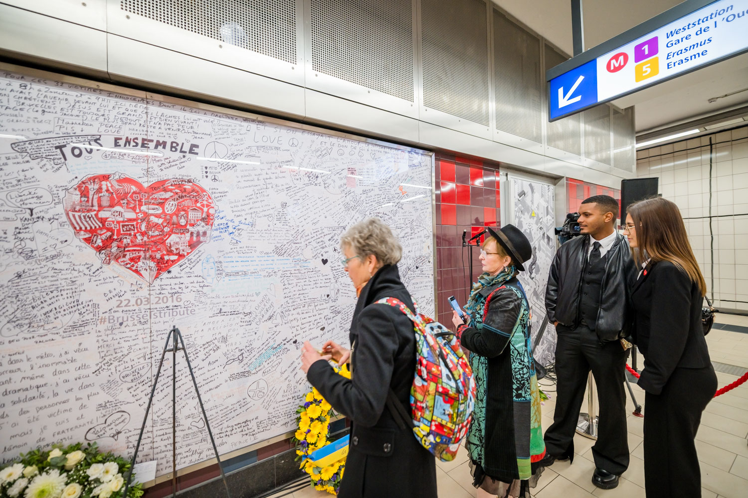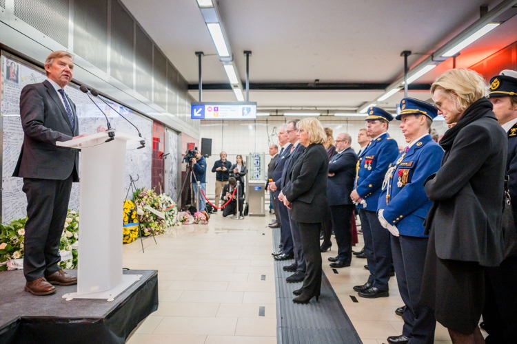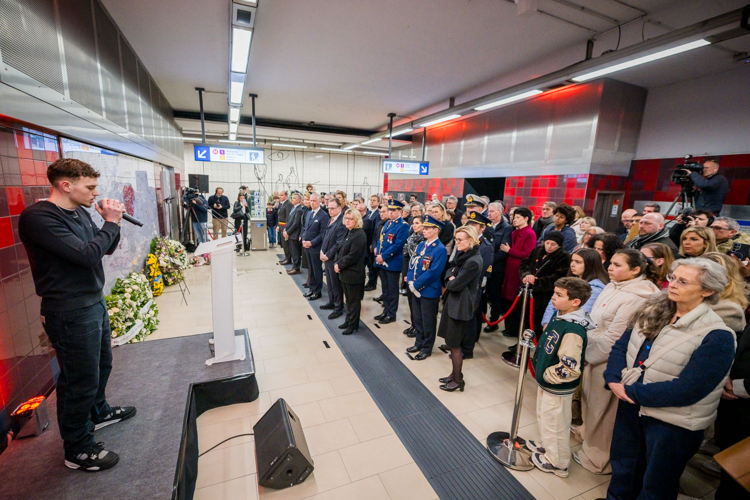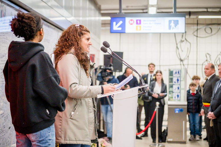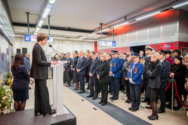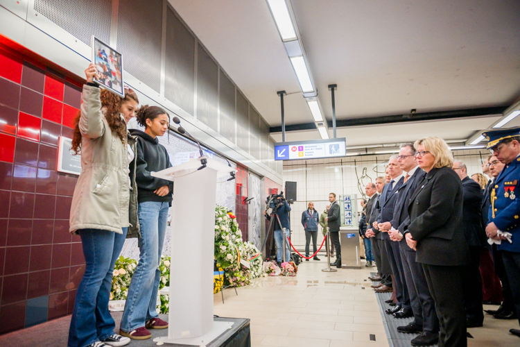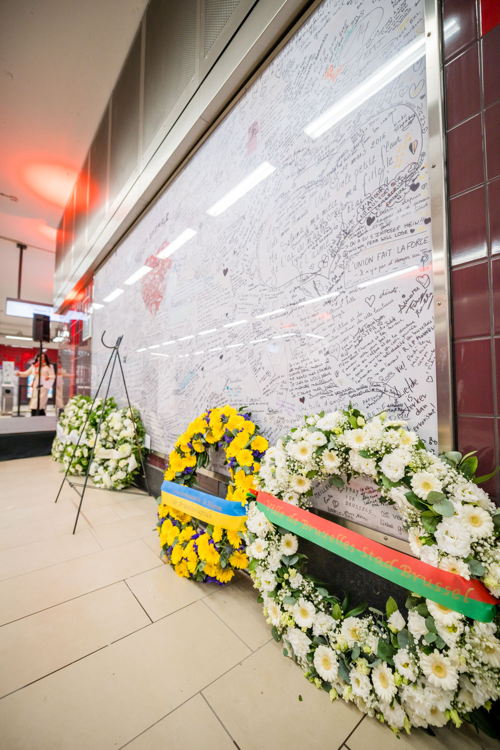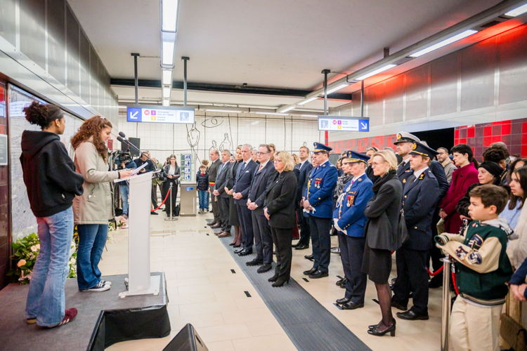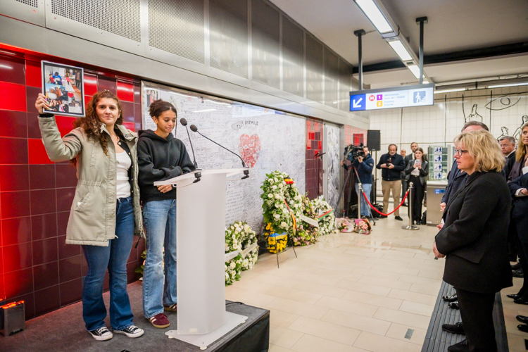 La cérémonie s'est tenue dans la mezzanine de la station de métro, devant le panneau en mémoire des victimes sur lequel témoignages et messages, inscrits tout autour du dessin d'un coeur, rappellent la douleur vécue lors des attentats, mais surtout l'espoir et la force qui unit chacun et chacune dans les moments difficiles.