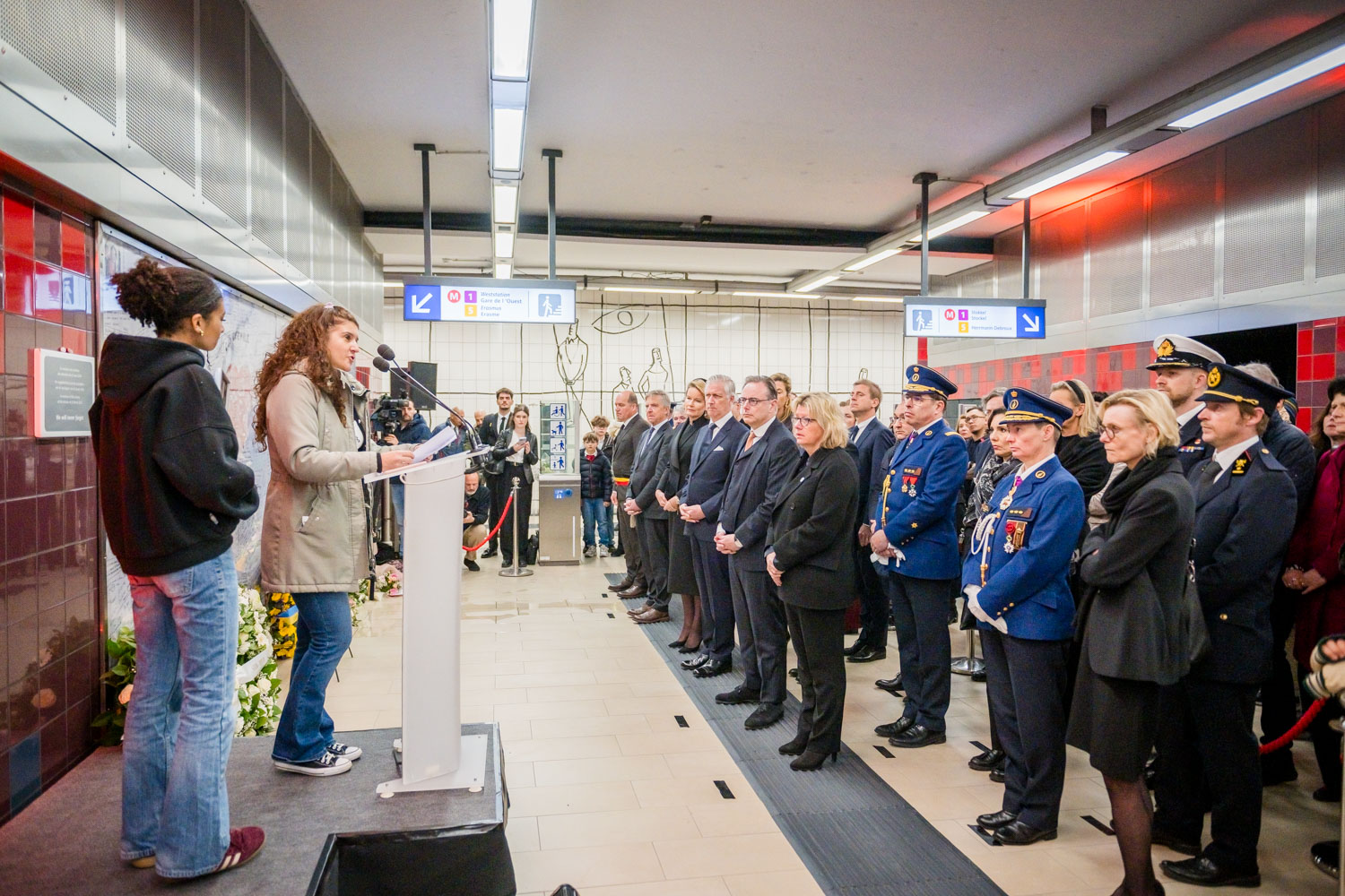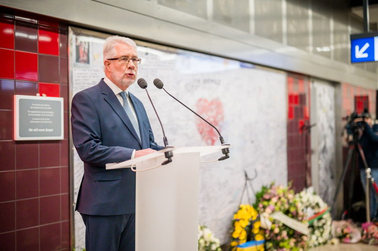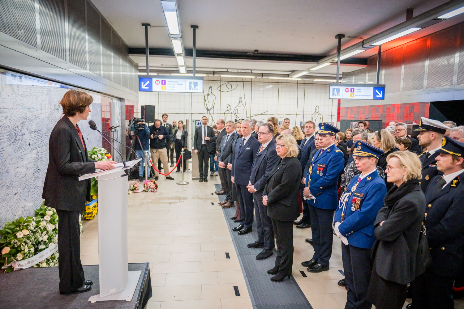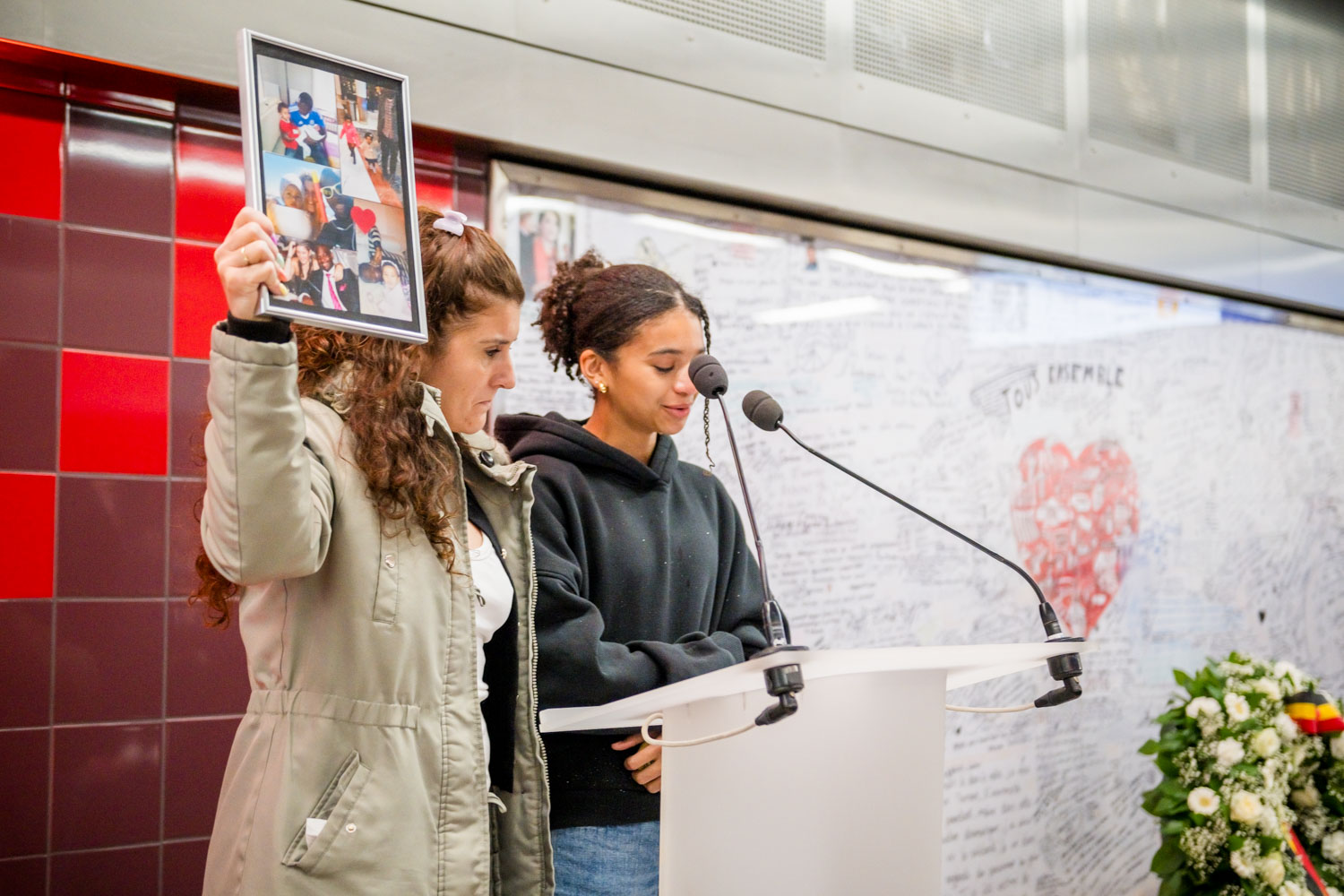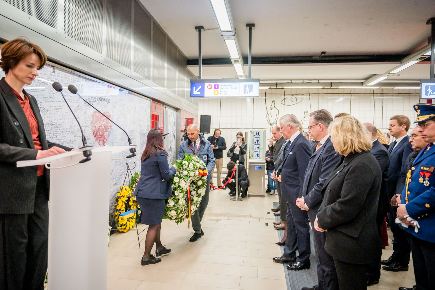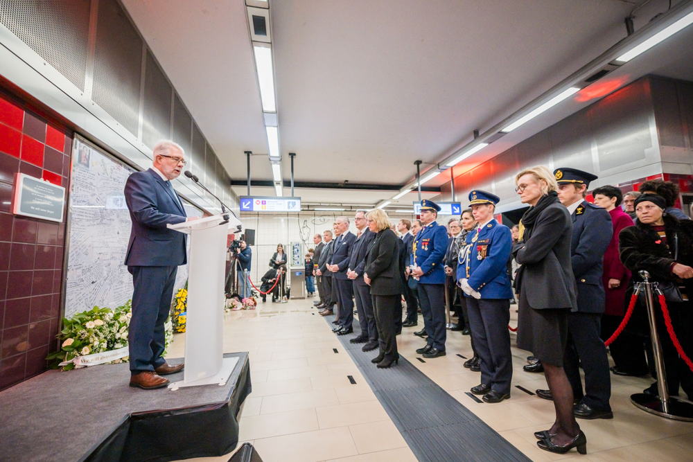La cérémonie s'est tenue dans la mezzanine de la station de métro, devant le panneau en mémoire des victimes sur lequel témoignages et messages, inscrits tout autour du dessin d'un coeur, rappellent la douleur vécue lors des attentats, mais surtout l'espoir et la force qui unit chacun et chacune dans les moments difficiles.