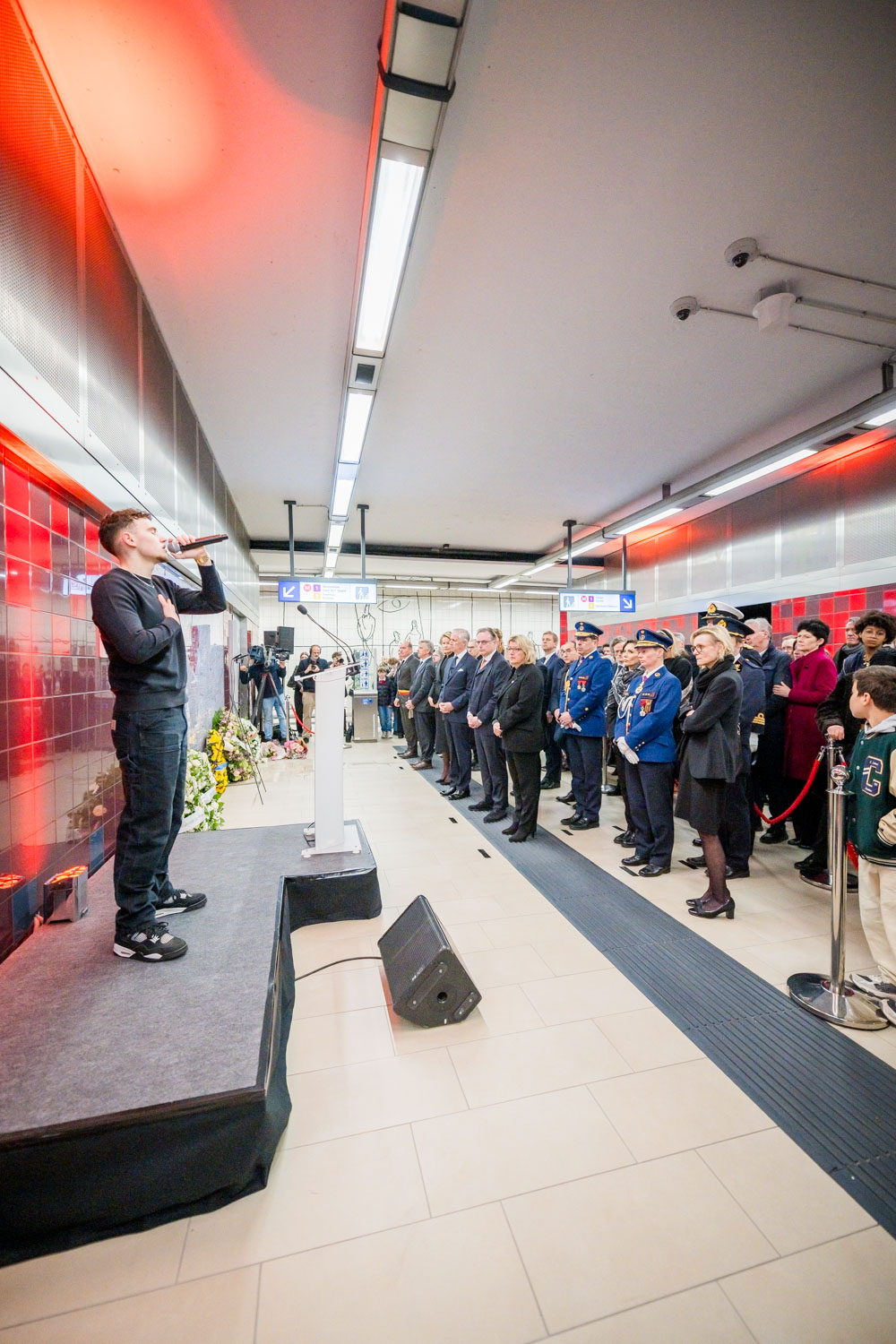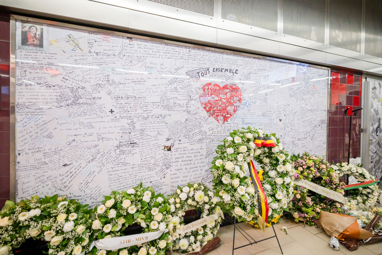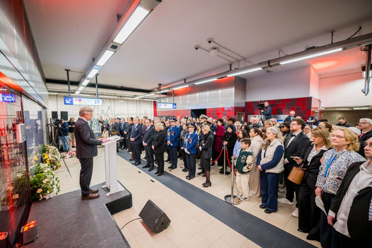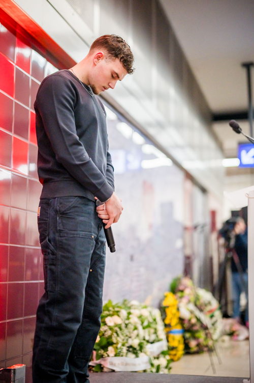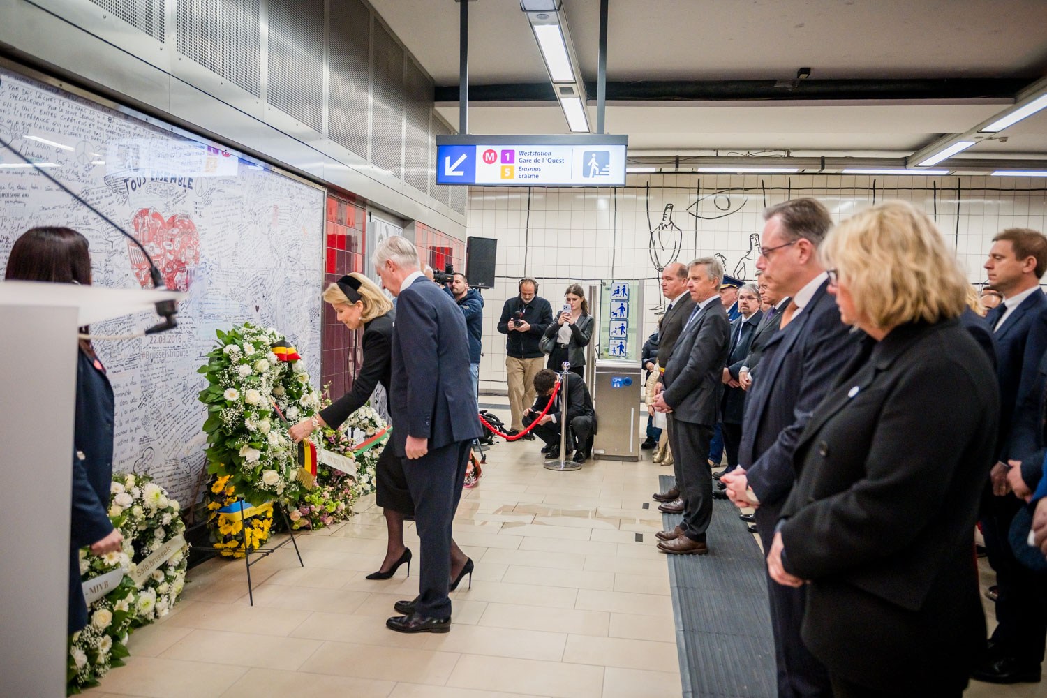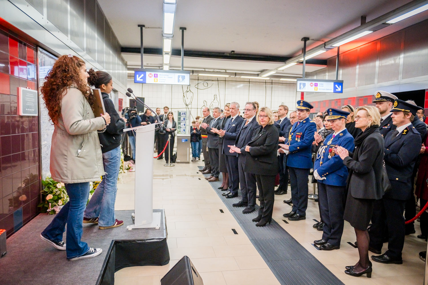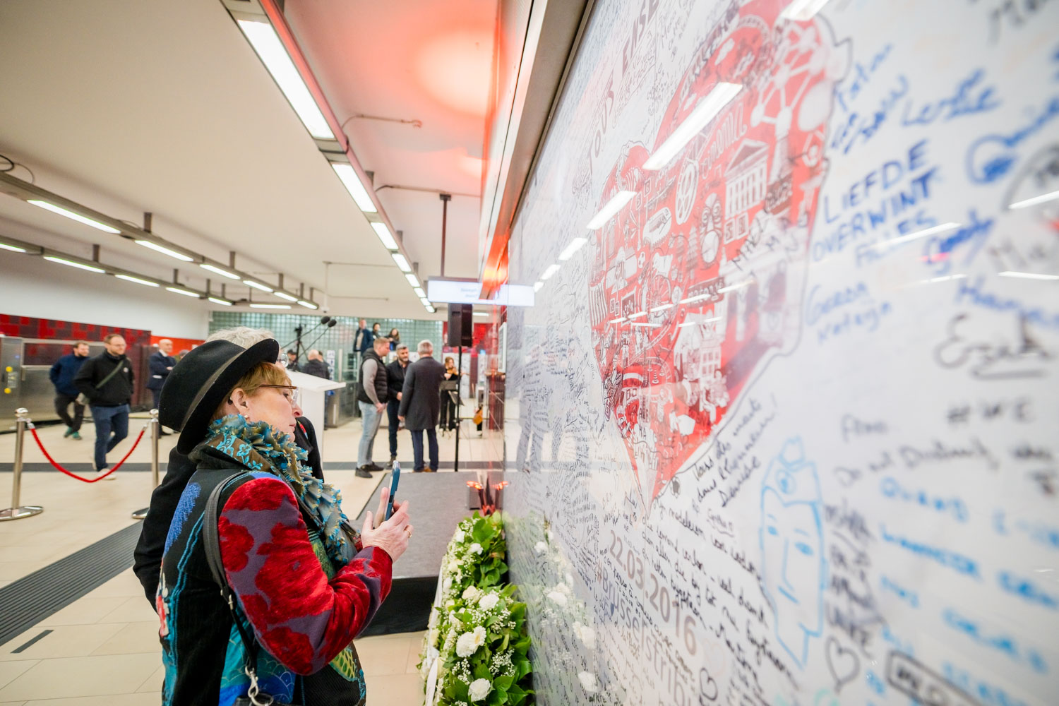 La cérémonie s'est tenue dans la mezzanine de la station de métro, devant le panneau en mémoire des victimes sur lequel témoignages et messages, inscrits tout autour du dessin d'un coeur, rappellent la douleur vécue lors des attentats, mais surtout l'espoir et la force qui unit chacun et chacune dans les moments difficiles.