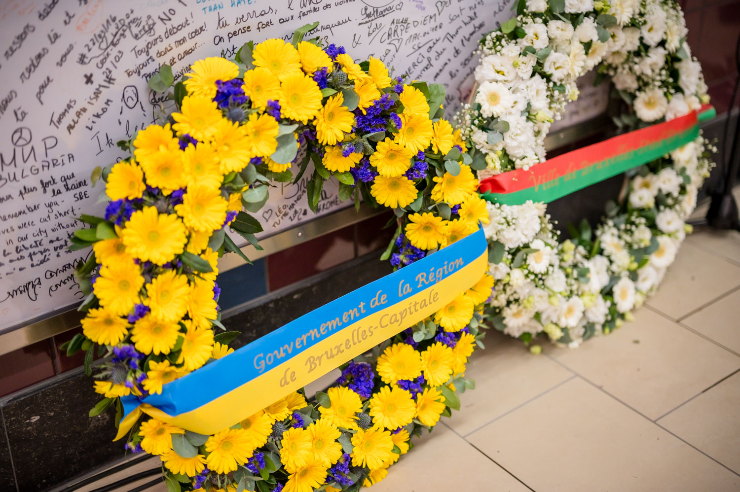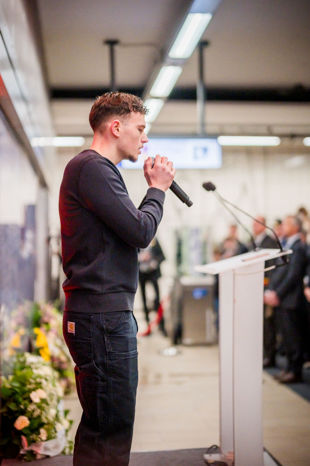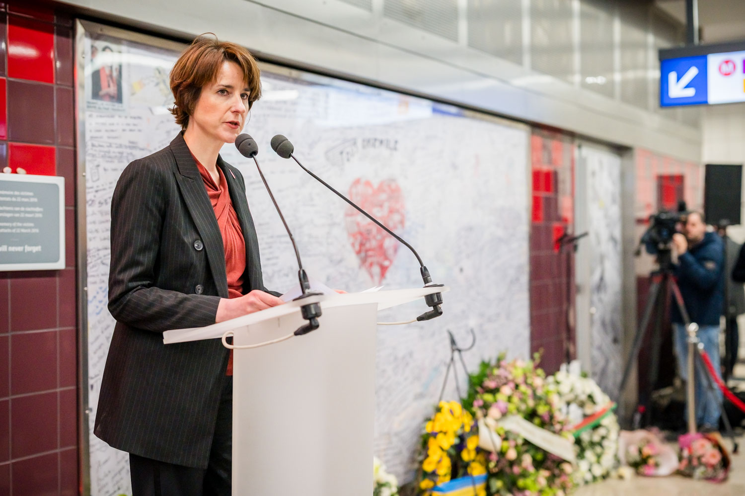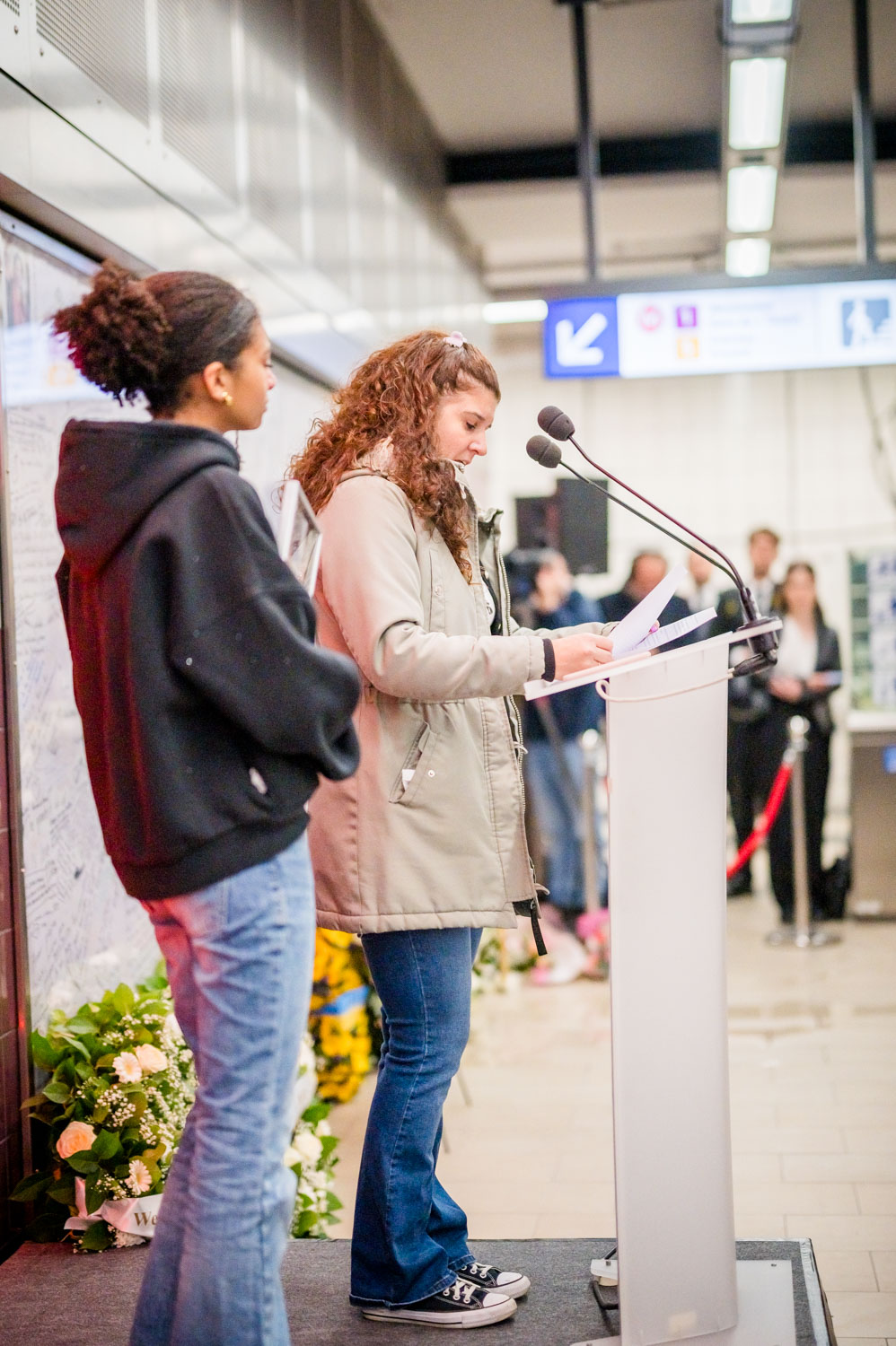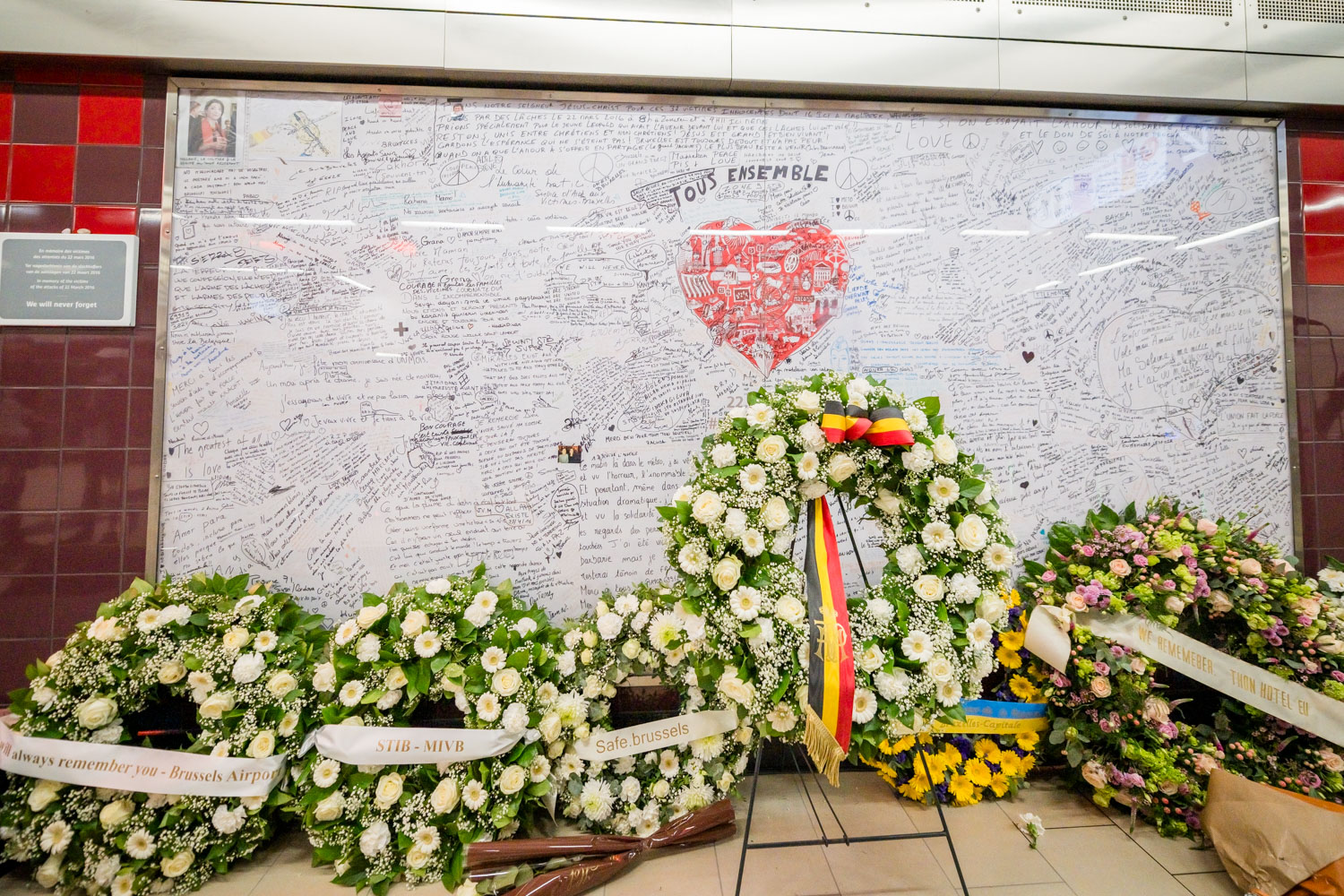 La cérémonie s'est tenue dans la mezzanine de la station de métro, devant le panneau en mémoire des victimes sur lequel témoignages et messages, inscrits tout autour du dessin d'un coeur, rappellent la douleur vécue lors des attentats, mais surtout l'espoir et la force qui unit chacun et chacune dans les moments difficiles.