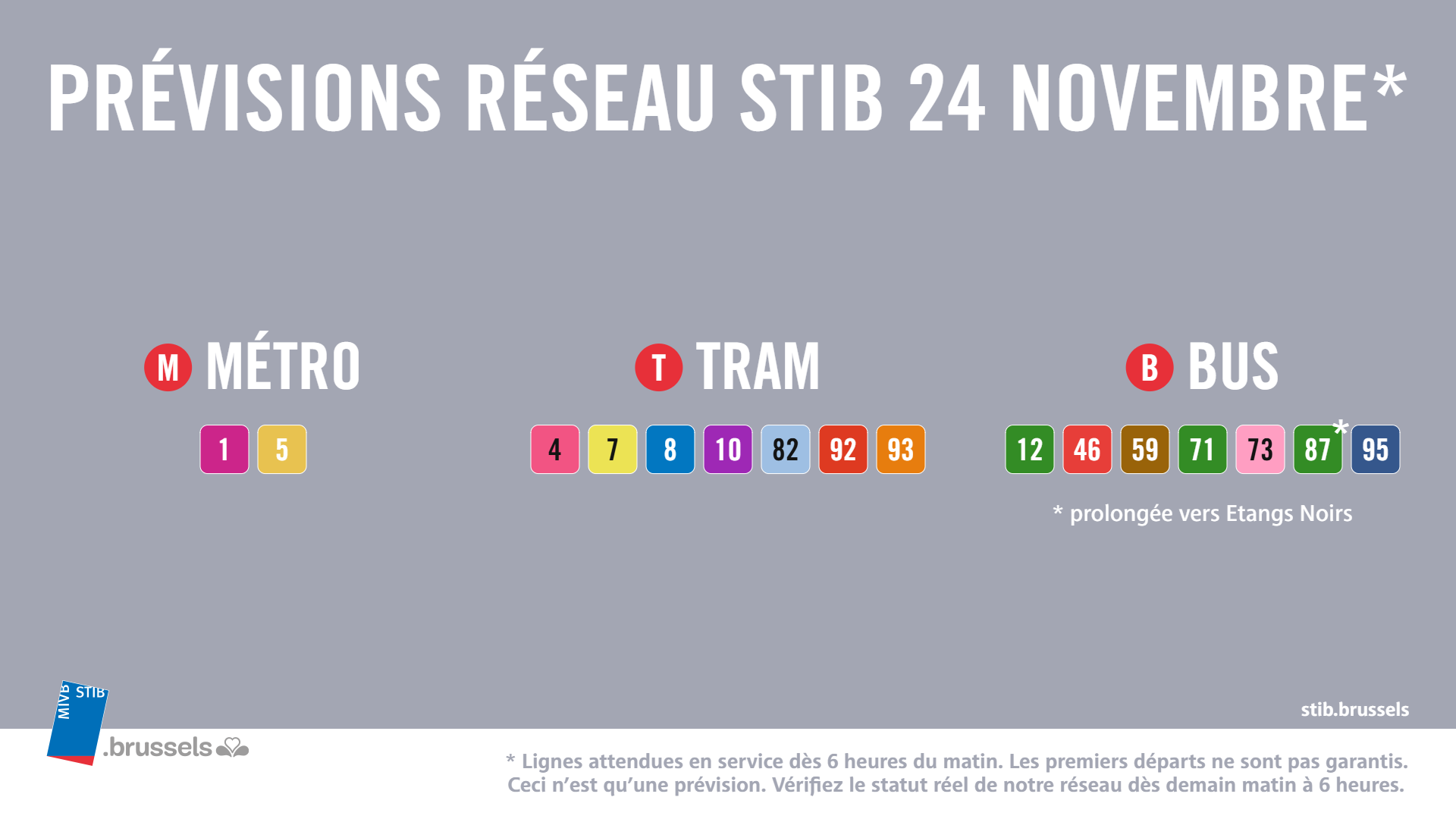 La STIB souligne que ces prévisions sont toutefois susceptibles de varier le jour même, étant donné que le personnel n’est pas obligé d’indiquer à l’avance s’il participe à la grève ou non. La situation effective sur le réseau ne sera connue qu’au début du service, vers 5h30. L’information sera progressivement mise à jour en temps réel, en fonction de la situation sur le réseau.