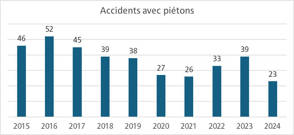 Cette évolution positive se ressent encore plus dans le nombre d’accidents avec piétons. En 2024, 23 accidents avec des trams impliquaient un piéton. Dix ans plus tôt, ce nombre dépassait systématiquement les 40, avec un record de 52 en 2016. Depuis lors, le nombre de collisions avec piéton a diminué de moitié. Les collisions avec des vélos et des trottinettes affichent également une tendance à la baisse (de 32 en 2022 à 26 en 2024), malgré l’augmentation significative du nombre de déplacements avec ces modes de mobilité douce.