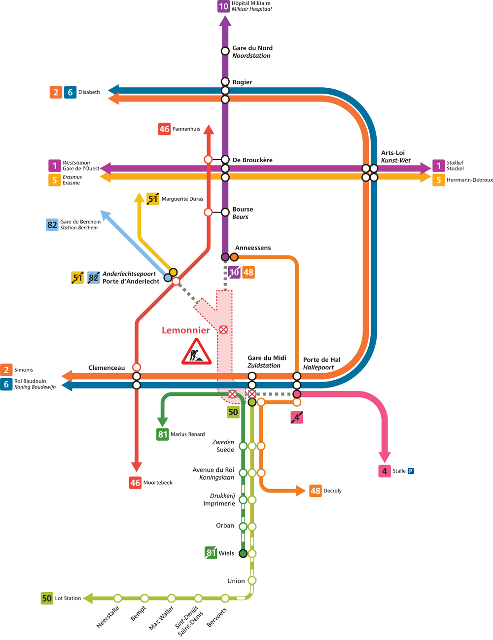 - Ligne 51 : les trams circuleront uniquement entre Marguerite Duras et Porte d’Anderlecht ; les arrêts Lemonnier et Gare du Midi ne seront pas desservis. Les trams circulent normalement sur le tronçon entre Belgica et Stade